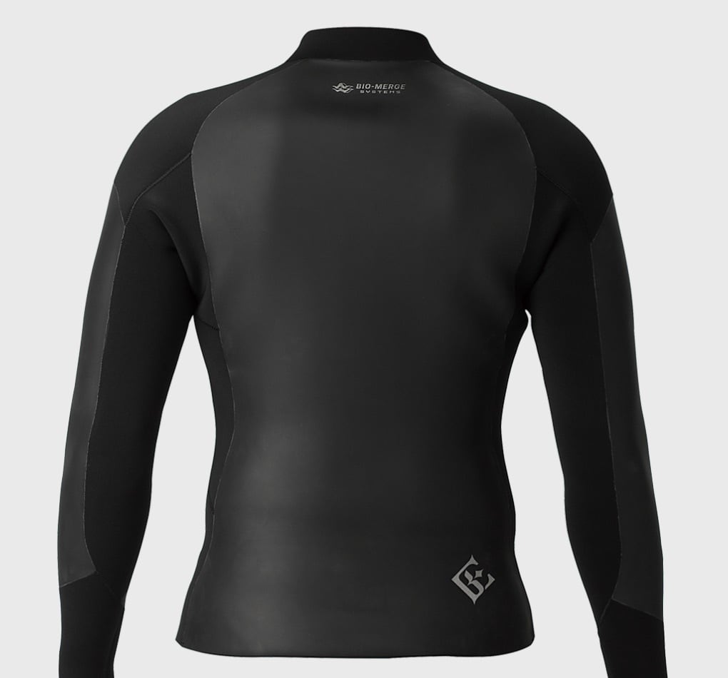 着脱時やダイビング中のさまざまな動きにも対応できるように、肩部分の運動性を高めるカットに変更。BCDを背負うと擦れがちな肩もジャージ生地に変更することで擦れに強くなりました。