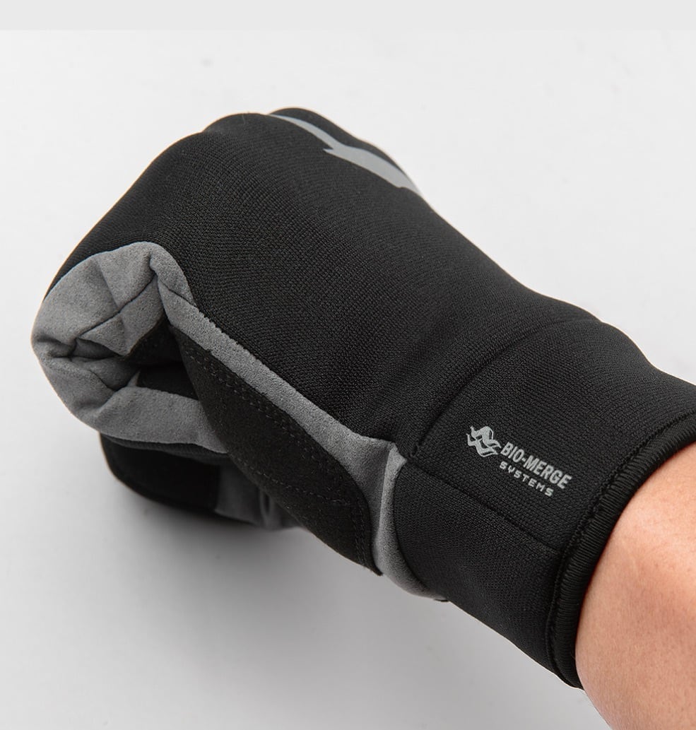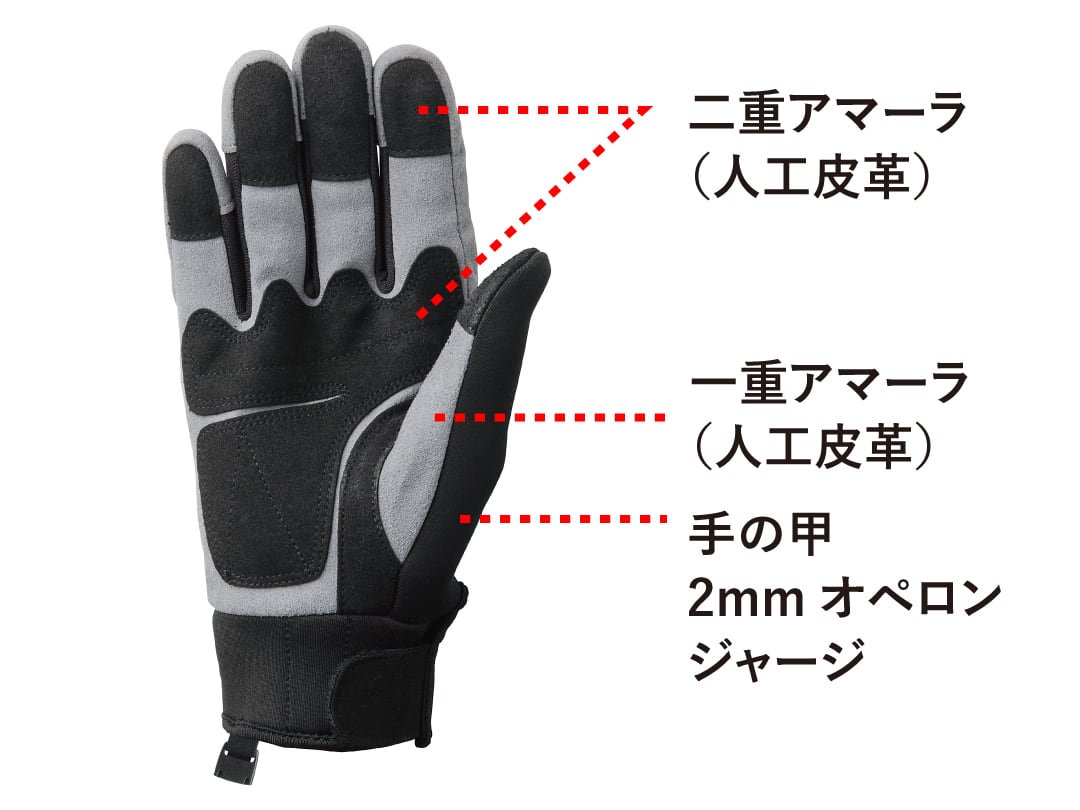 耐久性のあるアマーラ生地(人工皮革)を手のひらと指先に二重に重ねることで、グリップ力、耐久性、保護力を高めています。